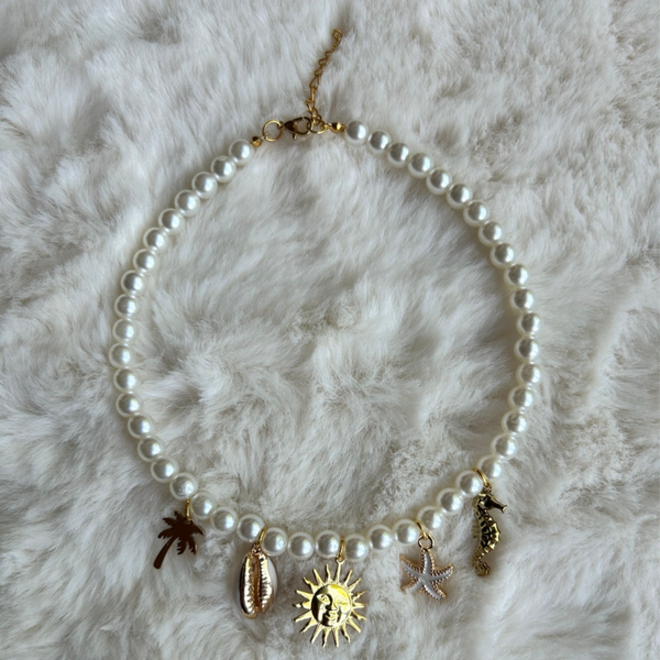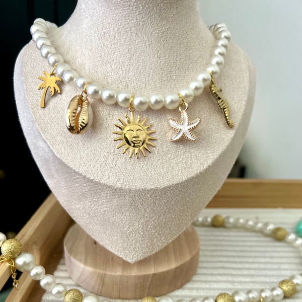 Ce magnifique collier en perles avec breloques est un accessoire parfait pour sublimer vos tenues au quotidien. Composé d'une chaîne en perles, il se distingue par cinq breloques chacune apportant une touche unique et originale. Sa chaîne d'extension permet d'ajuster facilement la longueur du collier pour un confort optimal.