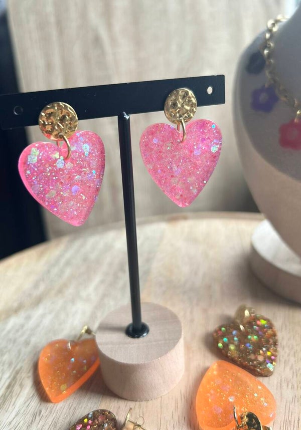 Découvrez ces jolies boucles d’oreilles en forme de cœur, fabriquées à la main avec soin. Chaque cœur est réalisé en résine, offrant un rendu unique et délicat grâce aux paillettes intégrées qui changent subtilement selon la lumière et l’angle de vue.