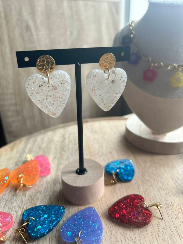 Découvrez ces jolies boucles d’oreilles en forme de cœur, fabriquées à la main avec soin. Chaque cœur est réalisé en résine, offrant un rendu unique et délicat grâce aux paillettes intégrées qui changent subtilement selon la lumière et l’angle de vue.